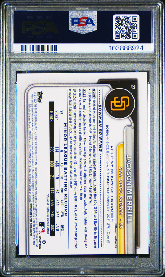 2024 Bowman Chrome Mega Box #27 Jackson Merrill Pink Refractor PSA 10