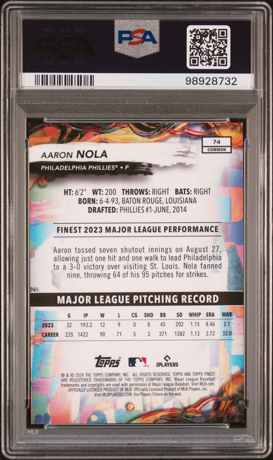 2024 Topps Finest #74 Aaron Nola Sky Blue Refractor PSA 9